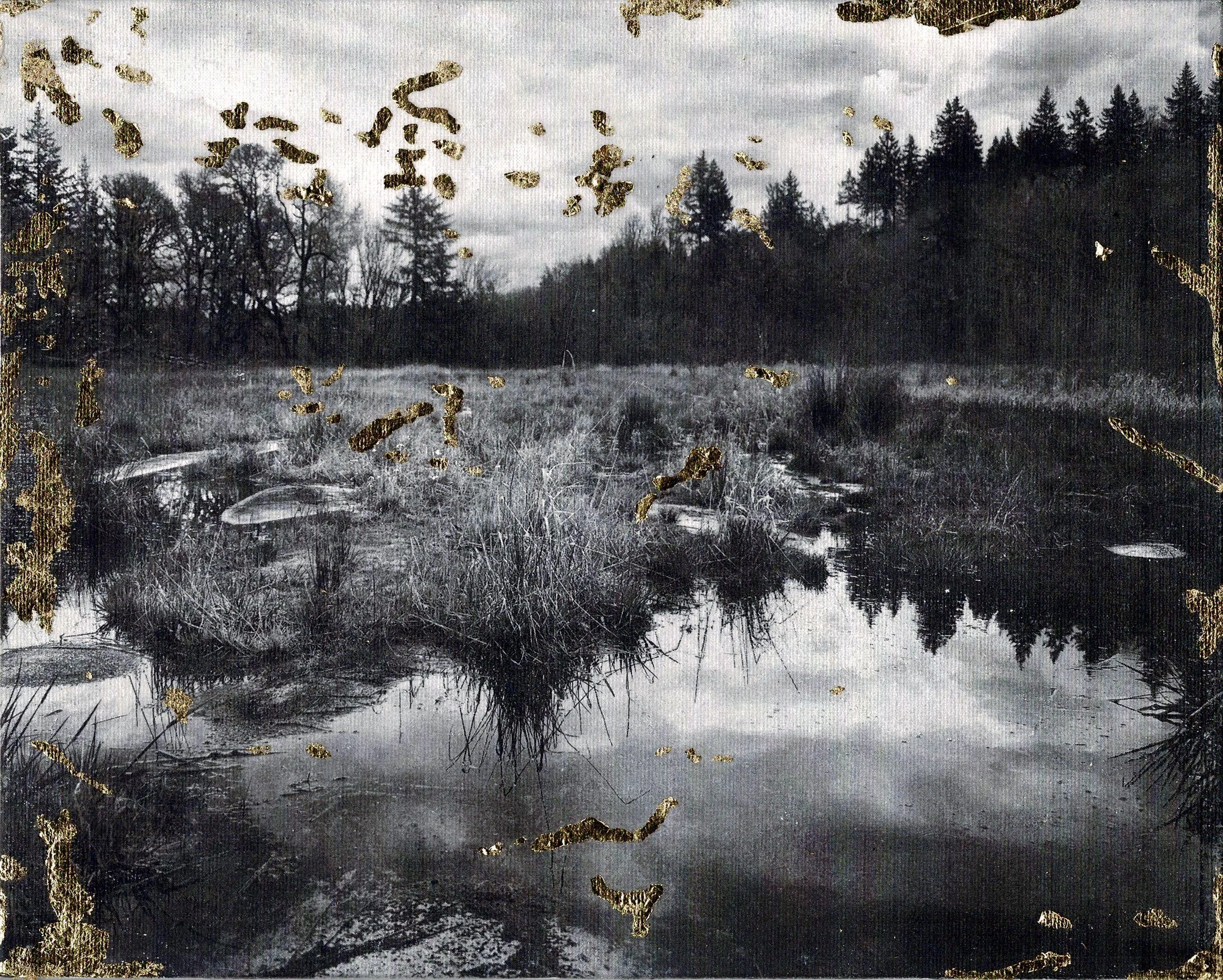 “i dig my fingers into the mire and leave the peat bruised and seeping. 2023” by M. Prull | Xerox transfer on canvas board and 22k gold leaf